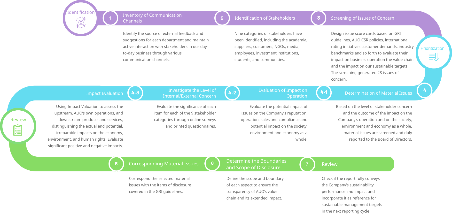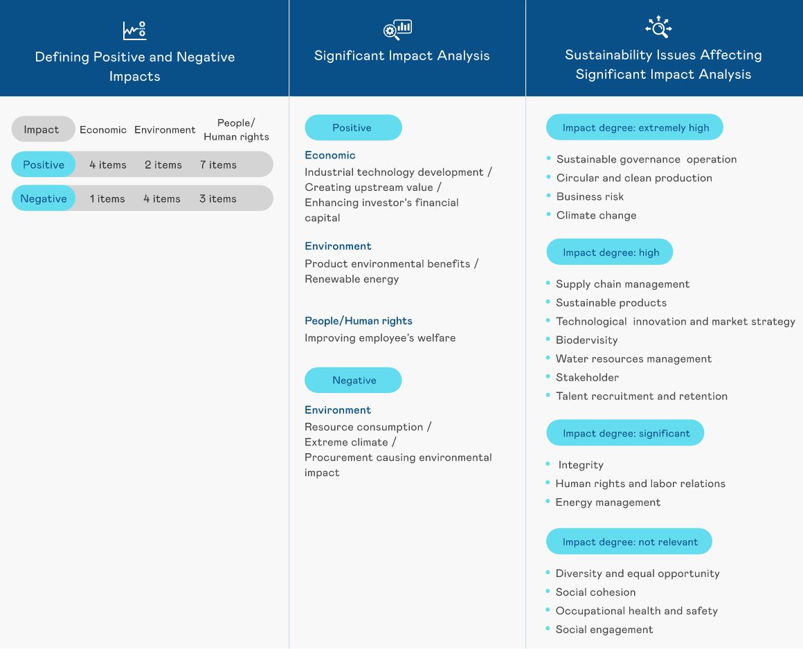 Assessing the relevance of issues based on global sustainability trends and GRI guidelines involves using surveys to understand stakeholders' concerns regarding the company's environmental, social (including human rights), and corporate governance aspects. A dual materiality assessment method is established to evaluate the operational impact of ESG issues on the company, with key partners in the company's value chain. External sustainability development impacts are evaluated based on the GRI Universal Standards 2021, integrating methodologies developed by the Value Balancing Alliance and the Harvard Business School's Impact-Weighted Accounts research project. This framework constructs an impact-based analysis process to identify material topics.