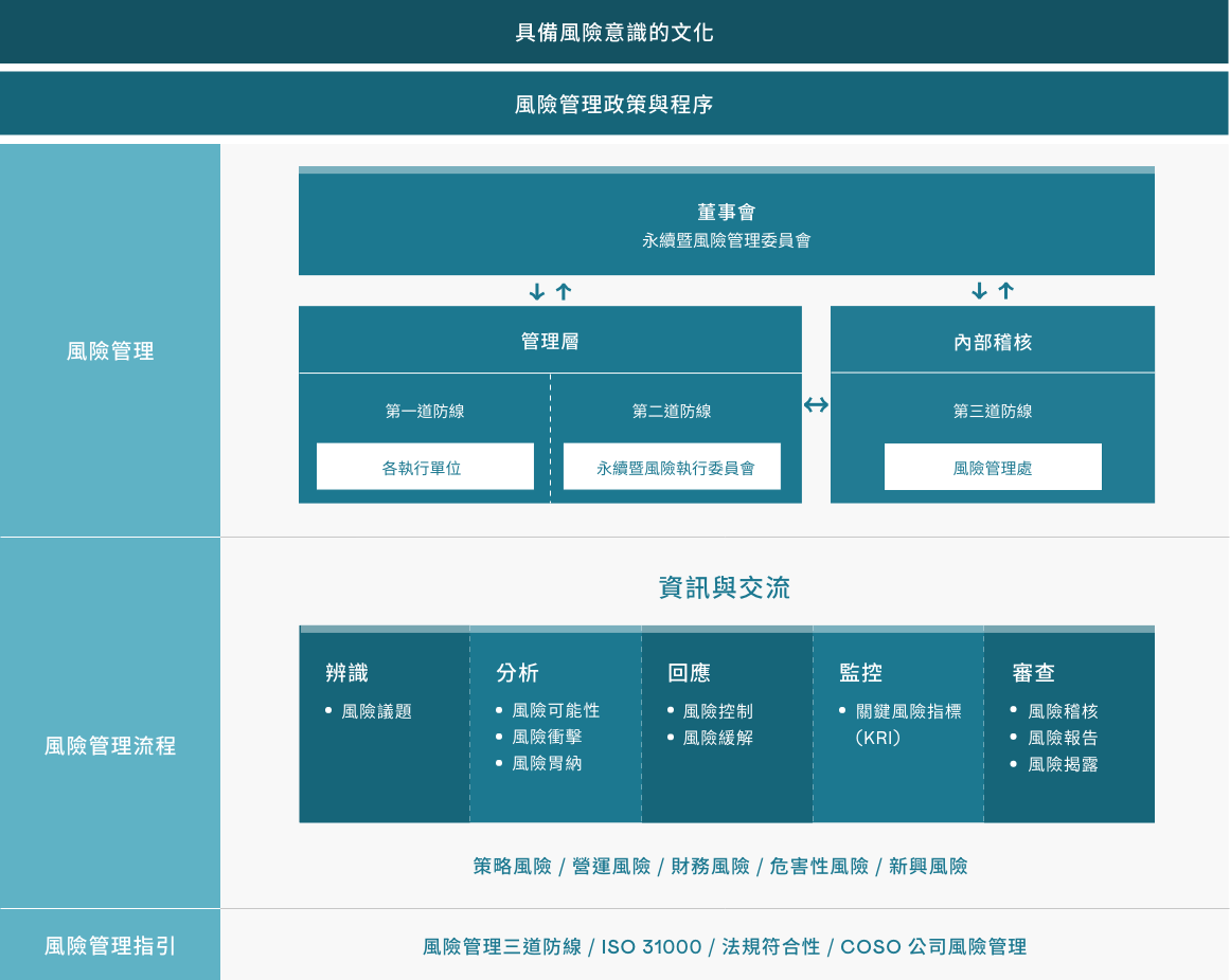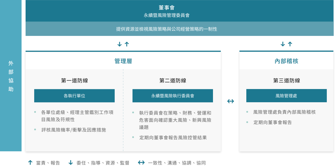 「永續暨風險執行委員會」執行風險管理政策和程序,包含審查公司的風險辨識作業,處理與風險控制相關議題,管理範圍涵蓋策略、財務、營運和危害等各個方面,並透過風險胃納,以質化及量化各項指標來控管風險衝擊,包括未來可能對公司營運產生衝擊的新興風險,定期向董事會及「永續暨風險管理委員會」報告。
