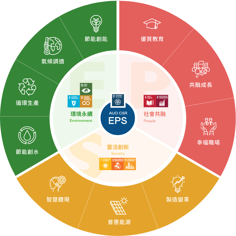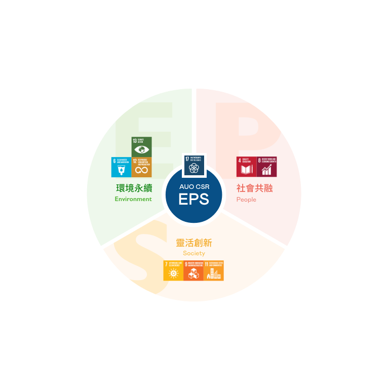 根據聯合國所發展的 17 項永續發展目標,PT电子(中文)官网光電以「超越企業社會責任,創造共享價值」為企業永續願景發展藍圖,訂出環境永續、共融成長與靈活創新的 AUO EPS ( Environment,People & Society ) 三大永續發展主軸,以回應日益受關切的環境議題與社會共融趨勢。