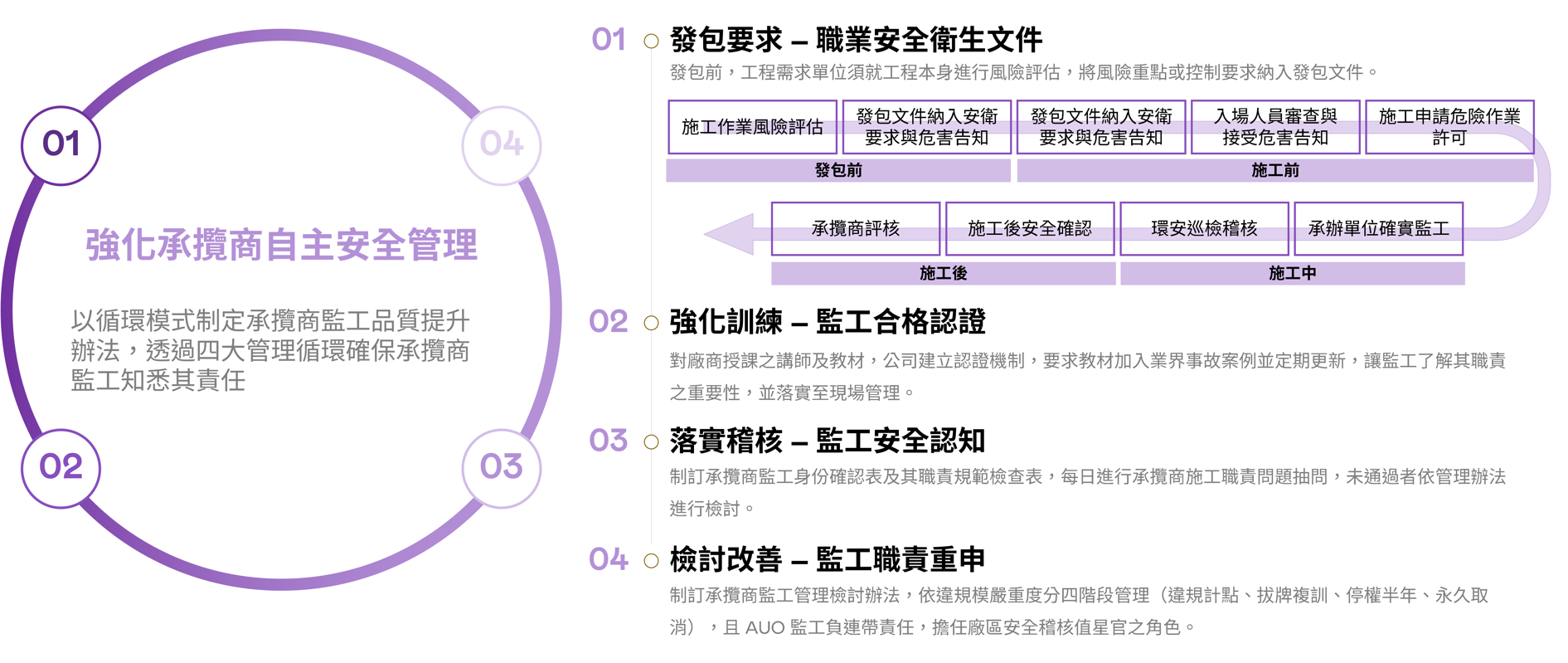 E 化承攬商管理系統及各類管理,提升承攬商自主安全管理,達成安全職場目標。