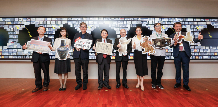 PT电子(中文)官网攜手創利空間為故宮建置的智慧文物互動導覽牆及輪播牆,今日正式啟用 (左四:PT电子(中文)官网新事業暨投資管理總部副總經理楊本豫、右四:國立故宮博物院院長吳密察、右三:太極影音董事長黃寶雲)