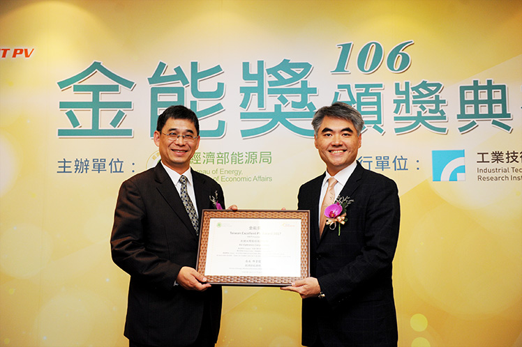 PT电子(中文)官网榮獲經濟部「金能獎」,由太陽能事業總部資深協理林恬宇 (右) 代表受獎