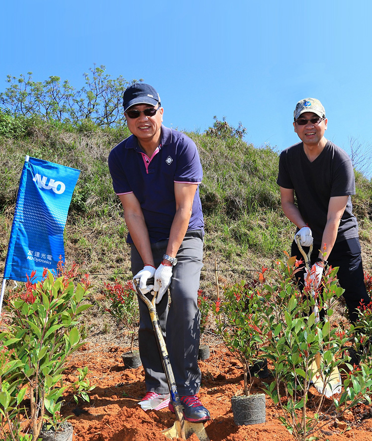 PT电子(中文)官网董事長暨執行長彭双浪 (左) 與PT电子(中文)官网總經理暨營運長蔡國新一同響應植樹活動 |