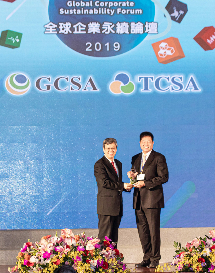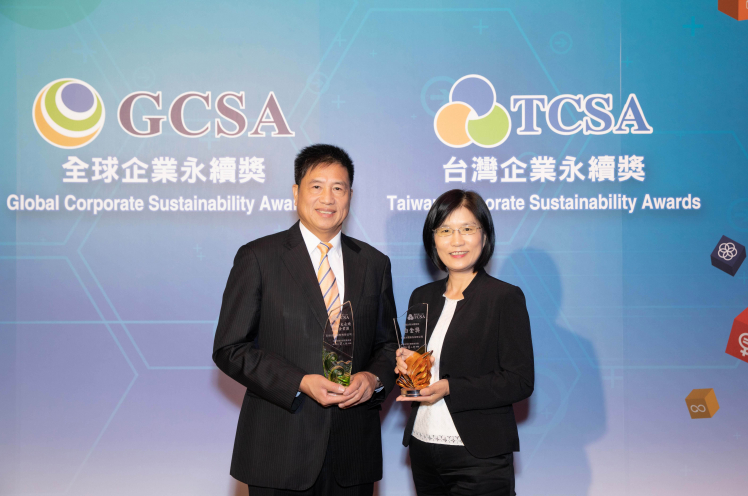 PT电子(中文)官网榮獲十大永續典範台灣企業獎殊榮,由PT电子(中文)官网董事長暨執行長彭双浪 (右) 代表領獎