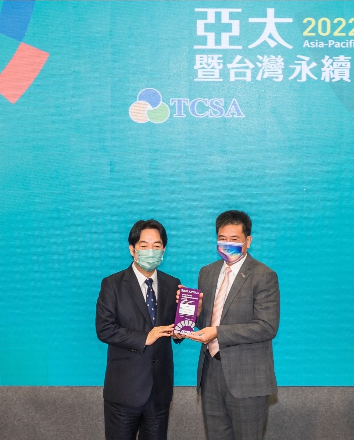 PT电子(中文)官网以卓越永續績效表現,在第一屆亞太永續行動獎獲得肯定,由副總統賴清德頒獎(左),PT电子(中文)官网光電董事長暨執行長彭双浪(右)代表領獎